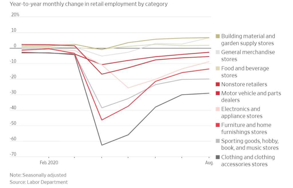 소매업은 일자리 감소가 영구적으로 지속될 수 있는 한 분야입니다. 노동부 월별 자료에 따르면 6월 이후 월평균 17% 가까이 매출이 증가했음에도 불구하고 스포츠용품 소매업체들의 고용은 작년 8월보다 20% 낮은 것으로 나타났습니다.