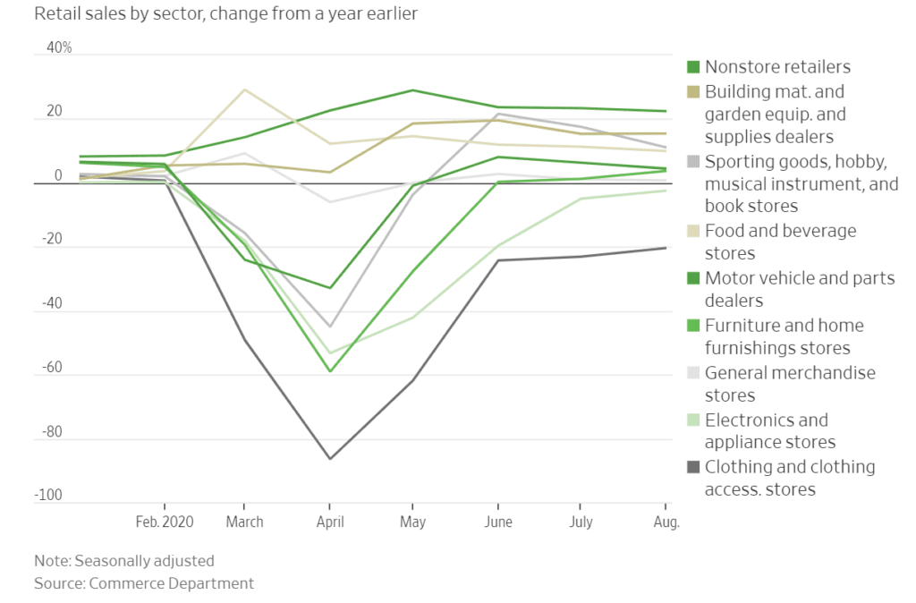 코로나 팬데믹 이후 섹터별 리테일 판 증가율 비교, Image from WSJ
