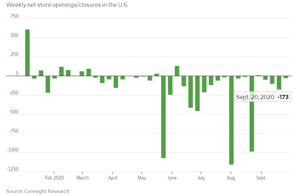 코로나 팬데믹 이후 주간 매장 폐쇄 및 신규 오픈 수 추이, Image from WSJ