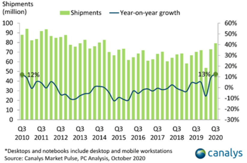 코로나 팬데믹으로 PC 시장이 기대 이상의 활황을 보여 10년 내 가장 높은 성장율을 보였다고 조사업체 카날리스가 20년 3분기 PC 시장 동향 보고서에서 밝혔습니다.