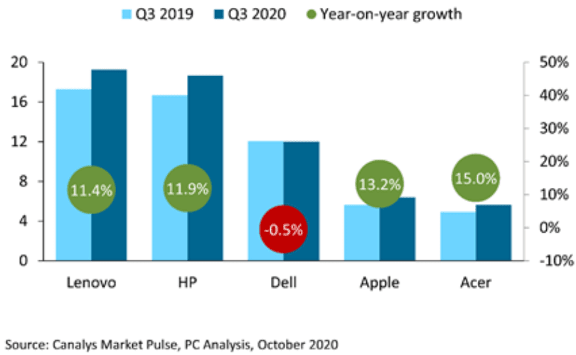 이러한 PC 수요 증가 와중에 레노버가 24.3%를 점유하면 다시 점유율 1위로 올라섰고, 이어 HP와 델 그리고 애플이 그 뒤를 이었습니다.