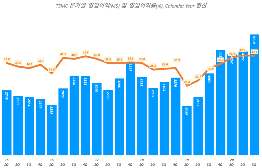 20년 3분기 TSMC 영업이익은 51.1억 달러로 사상 처음으로 분기 영업이익이 50억 달러를 넘었습니다.