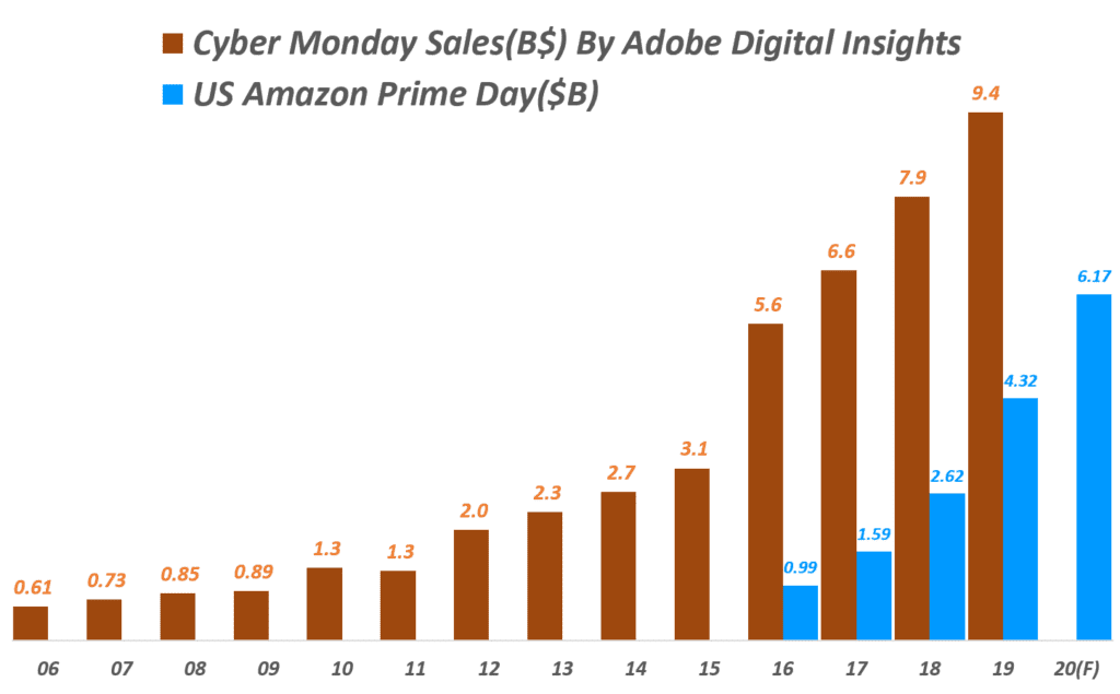 연도별 사이버먼데이 및 아마존 프라임데이 판매액 추이, Yearly Cyber Monday & Amazon Prime Day sales, Data from Adobe digital & eMarketer, Graph by Happist