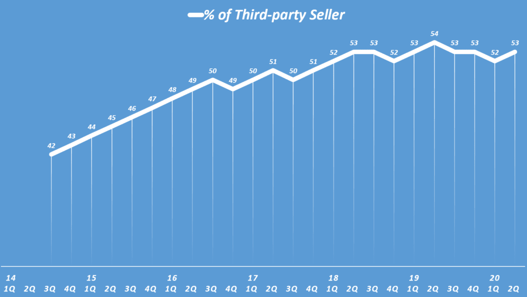 아마존 플랫폼에서 서드파티가 차지하는 비중을 20년 2분기 기준 53%로 절반 이상을 차지하고 있습니다. 아마존 서드파티 비중은 2018년 이래 52~54% 범위 내에서 큰 변동은 없었습니다.