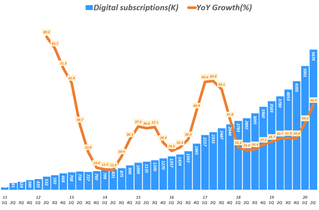 20년 2분기 기준으로 디지탈 구독 매출은 29.6% 증가했고, 디지타 구독 매출이 전체 매출에서 차지하는 비중도 36.2%에 달했습니다.