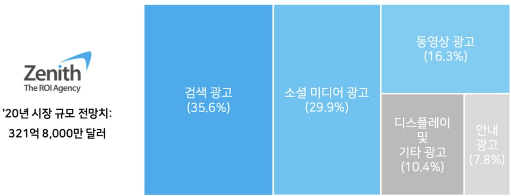 광고 전문 조사 기관인 Zenith가 발표한 ’20년 디지탈 광고 시장 규모” 자료에 따르면 검색광고가 35.6%, 소셜 미디어 광고 29.9%, 동영상 광고 16.3%, 디스플레이 및 기타 광고 10.4% 그리고 안내 광고 7.8% 비중을 보이고 있다고 합니다.