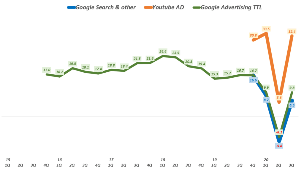 그렇지만 검색광고 외에도 동영상 광고나 네트워트 광고 등으로 트렌드를 반영할 수 있도록 다양한 광고 비즈니스 포트폴리오를 적절히 운영하고 있는 구글은 2분기 잠깐 어려움을 겼었지만 아직도 크게 회복하지 않은 검색광고를 빼고도 3분기에는 정상화에 가능했었습니다.