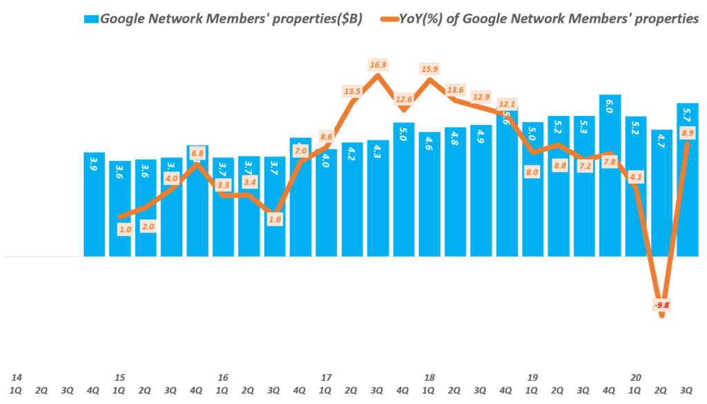 이러한 디스플레이 광고도 코로나 팬데믹으로 인한 광고 수요 급감을 피해 가지는 못했습니다. 구글 실적에서 디스플레이 광고에 해당하는 Google Network Member’s properties 매출은 코로나 팬데믹으로 경기 침체가 절정에 달했던 2분기엔 -10% 감소했고, 어느 정도 경제가 활성화 된 3분기에는 8.9% 성장으로 다시 복귀했습니다.