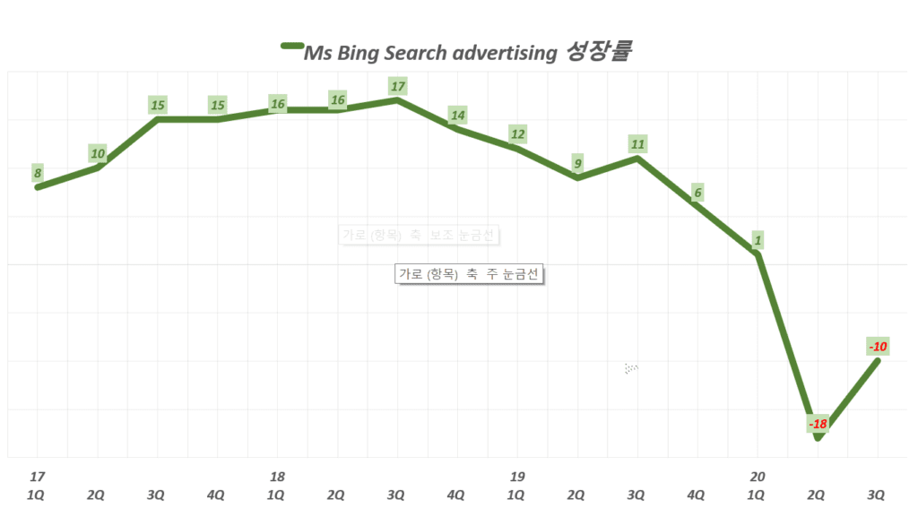 아무튼 빙을 기반으로 한 마이크로소프트의 검색 광고는 코로나 팬데믹이 본격화된 지난 2분기에는 -18% 역성장했고, 3분기에도 -10%로 여전히 역성장을 지속했습니다.