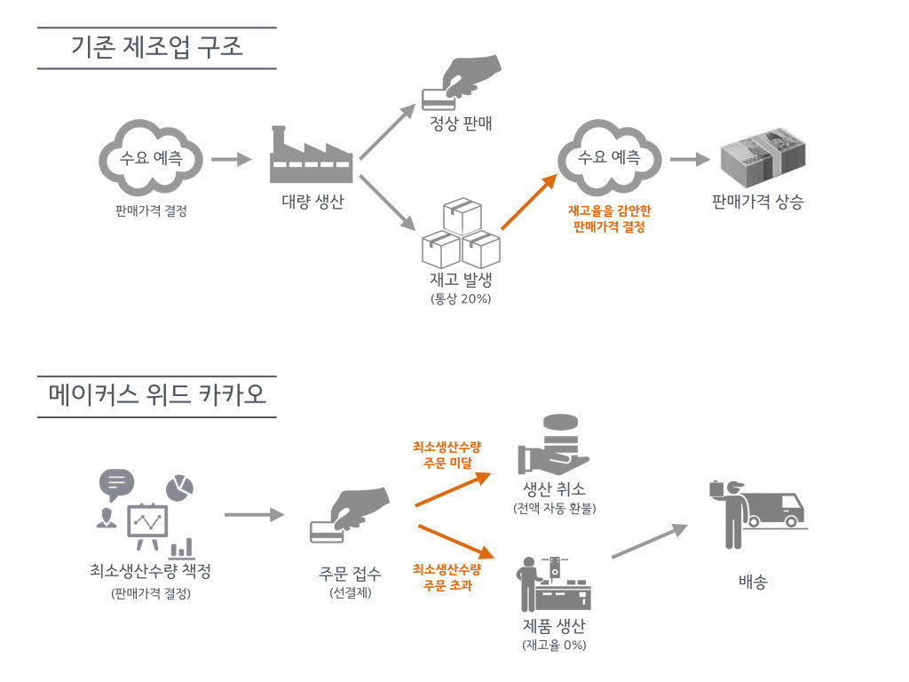 이 서비스는 5,200만명에 달하는 카카오톡 사용자를 기반으로 제조회사가 먼저 샘플을 보여주고 이용자들의 주문을 받아 생산하게 되는데요.