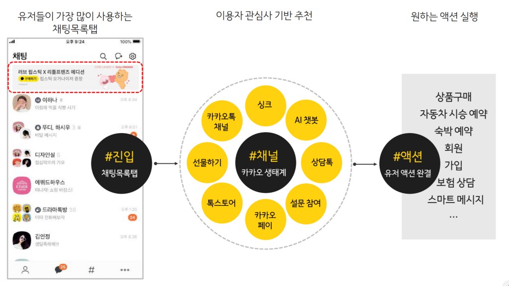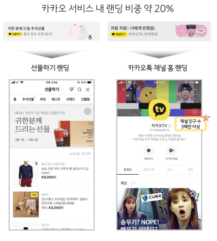 여기에 카카오가 확보한 빅데이타를 기반으로 상품 큐레이션, 할인 안내, 가격 비교 정보들을 광고, 알림톡 등 다양한 카카오톡 내의 커뮤니케이션 방법을 통해서 알려줘 트래픽을 극대화 할 수 있습니다.