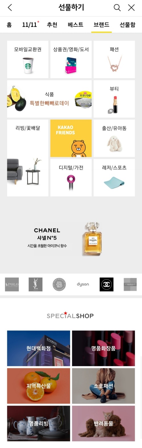 이를 잘 포착해서 카카오 선물하기에는 이미 다양한 명품 브랜드들이 입점해 있습니다. 거기다가 현대백화점, 명품 화장품 등 스페셜샵들이 들어와 있어 이러한 욕구를 어는 정도 해소해 줄 수 있습니다.