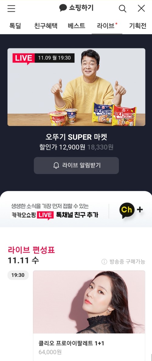 카카카오톡에서 쇼핑하기로 진입 후 라이브 메뉴마 누르면 바로 ‘카카오쇼핑라이브’에 참여할 수 있기 때문에 별고 어플 설치할 필요없이 라이브 커머스에 참여 가능합니다.