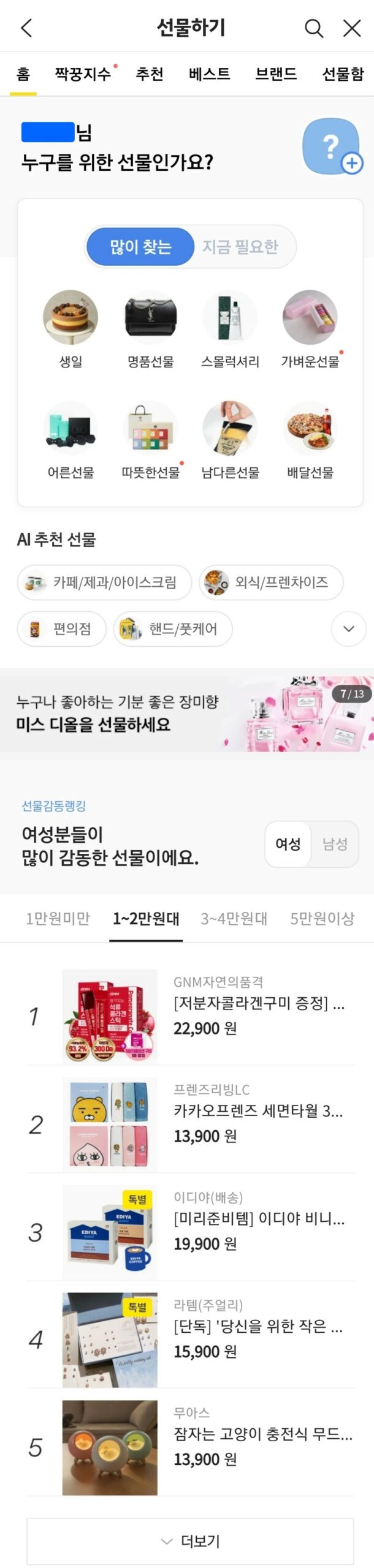 현재도 카카오톡 선물하기에 들어가면 다양한 추천 선물리스트를 보여 주는데요.