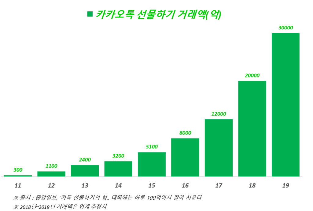 카카오톡 선물하기는 2010년 서비스를 도입 후 2011년 거래액은 300억에 불과했지만 서비스 런칭 10년이 된 2019년에는 10배인인 3조원을 넘겼습니다. 산술적인 계산으로는 매년 1배씩 늘어난 셈입니다.