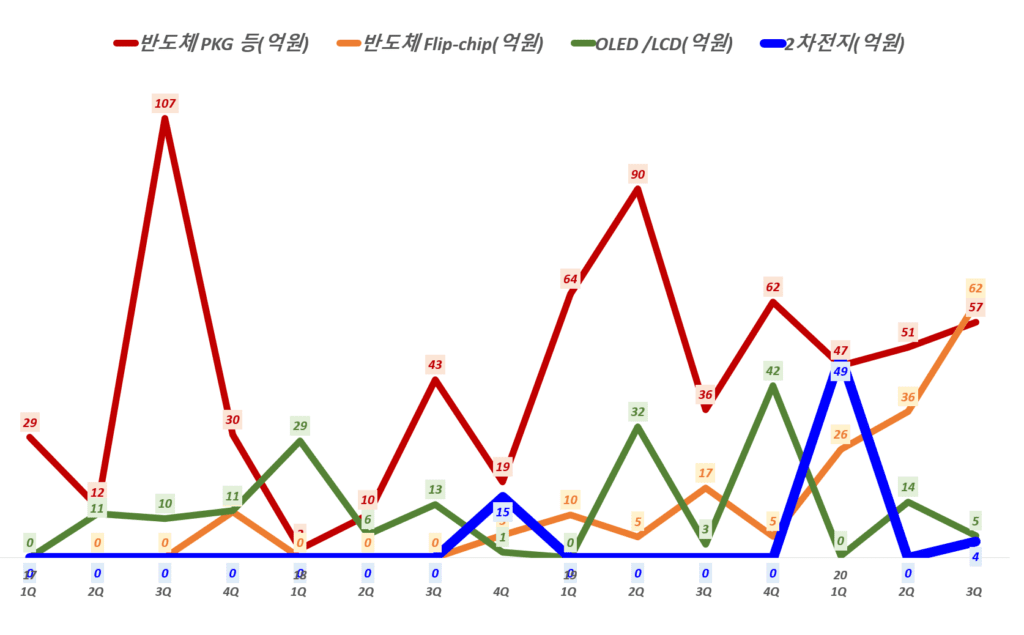 디스플레이 검사장비는 5억 매출로 전년 비 -45% 감소했고, , 2차전지 검사장비는 4억 매출로 3분기엔 처음으로 매출이 발생했습니다.