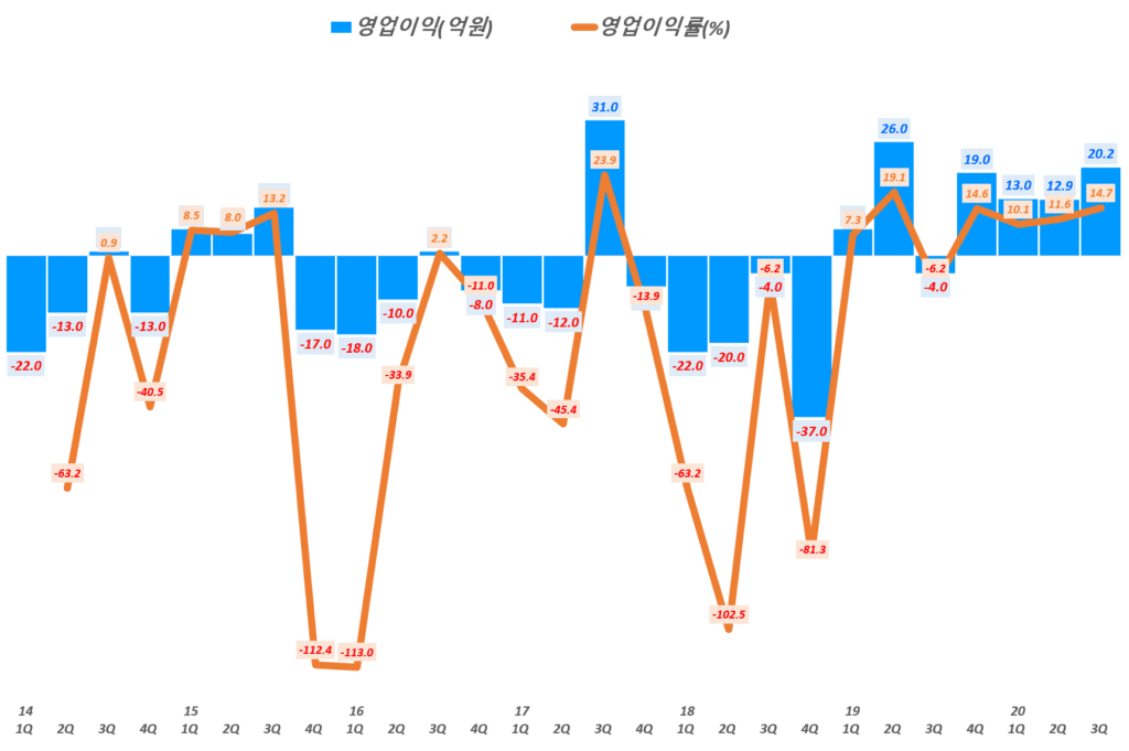 20년 3분기 인텍플러스 영업이익은 20.2억원으로 전년 동기 -4억 적자에서 흑자 전환하며 605% 증가했습니다. 전 분기 영업이익 12.9억원에 비해서도 57.2% 증가했습니다.