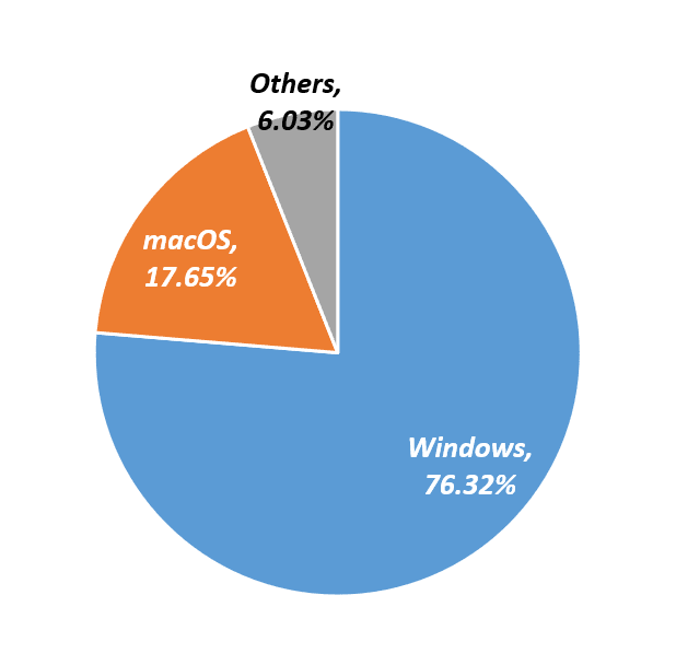 데스크탑 OS 시장점유율은 2020년 10월 현재 윈도우즈 76.32% vs macOS 17.65%로 아직도 윈도우즈가 대부분 시장을 장악하고 있지만 점차 macOS 점유율이 높아질 가능성이 있습니다.