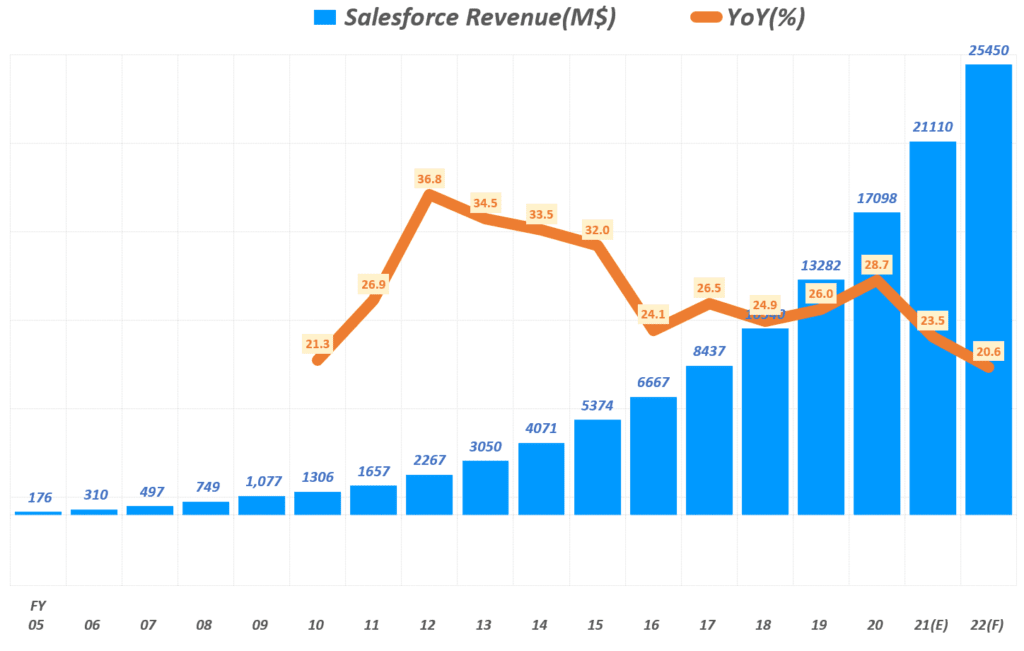 아래 연도별 매출 그래프를 보는것처럼 매년 2~30%씩 성장을 거듭해 올해(회계년도 21년) 매출 211억 달러를 예상하고 있으며 내년에는 255억 달러까지 늘어날 것으로 보고 있습니다.