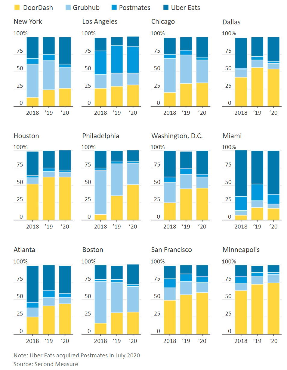 미국 음식 배달업체들의 도시별 점유율 추이, Graph by WSJ