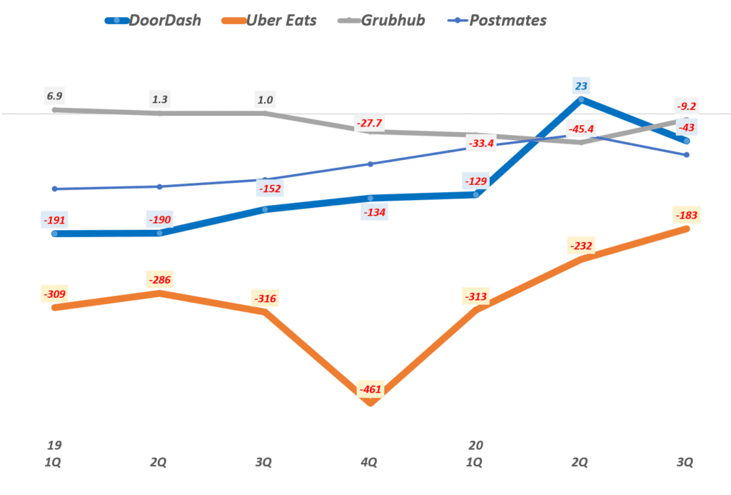 미국 음식배달 업체들의 순이익 추이를 살펴보면 그럽허브가 보수적으로 운영하고 있기 때문에 상대적으로 흑자 또는 적자 수준이 매우 낮은 수준을 유지하고 있고 공격적인 마케팅을 펼치는 도어대시 적자가 가장 심하네요..