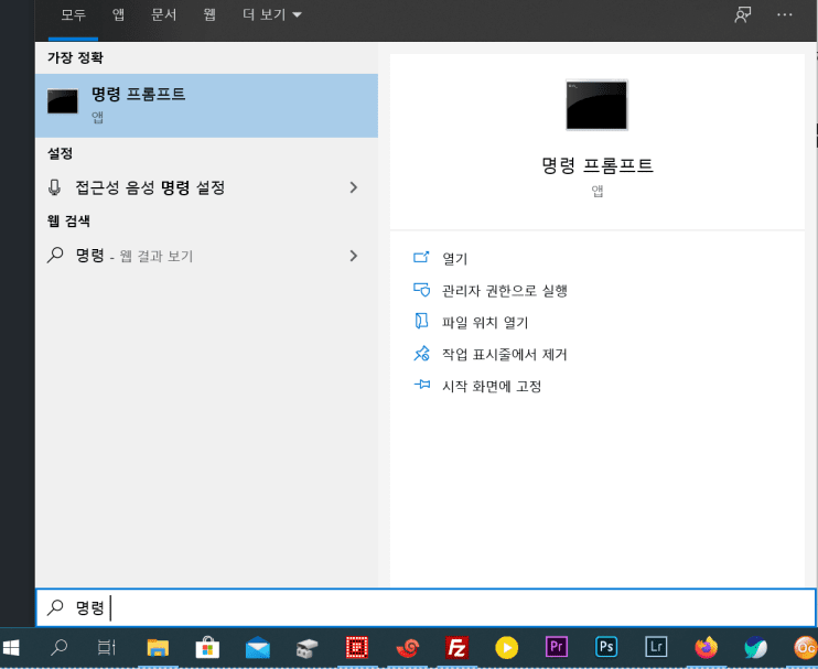 이를 사용하려면 명령 프롬프트로 이동해야 합니다. 이를 위한 가장 간단한 방식은 왼쪽 하단의 찾기에서 ‘명령’ 을 입력해 명령 프롬프트로 이동하는 것입니다.
