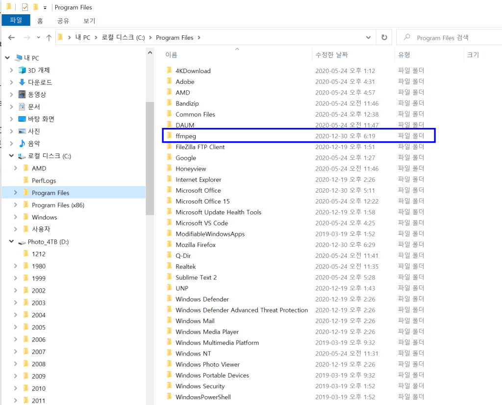 굳이 나쁜 선택은 아닌 듯 싶어서 저도 프로그램 설치 폴더아래에 ffmpeg라는 폴더를 만들고 여기에 관련 파일을 이동시켰습니다.