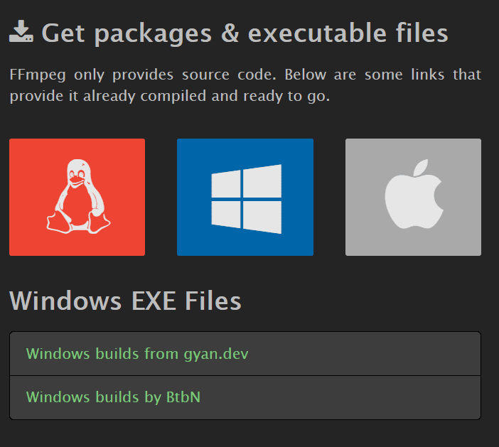대신 정식 ffmpeg 다운로드 사이트에서 리눅스, 위도우, 맥용 다운로드 사이트를 각각 연결해 주고 있습니다. 윈도우용은 아래 이미지에서 보듯이 gyan.dev나 BtbN의 두 곳에서 다운받을 수 있습니다.