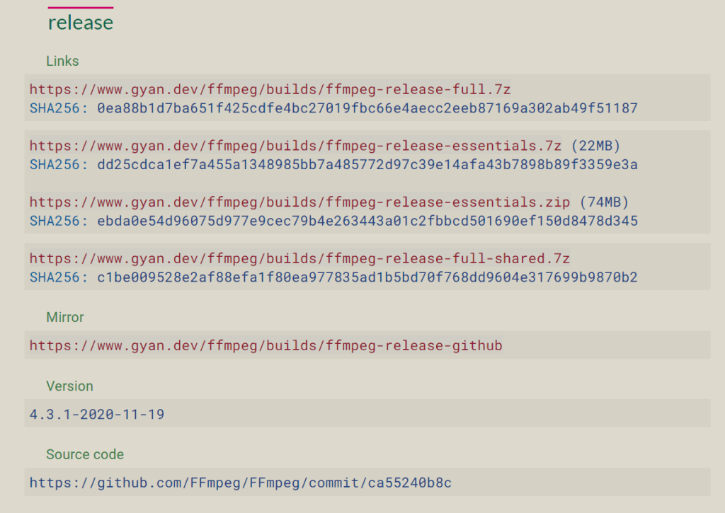 gyan.dev 이동하면 FFmpeg Windows Builds에 대한 설명이 나오고 조금 더 내려가면 release(배포)라는 제목을 만날 수 있습니다.