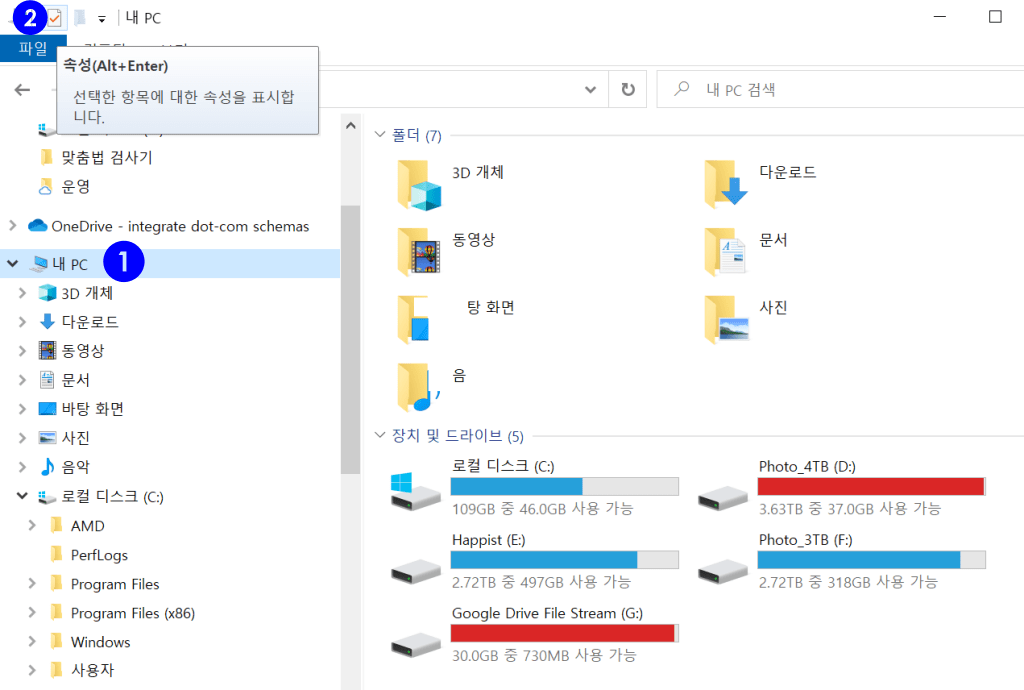 바탕화면에 있는 내 컴퓨터(또는 내 PC) 아이콘을 클릭하거나, 윈도우 10 설치 방법에 따라 바탕 화면에 그런 아이콘이 없는 경우는 탐색기에서 내 PC를 눌러 나오는 화면의 맨 위쪽 빨간 체크 표시가 있는 속성탭을 눌러 시스템으로 이동할 수 있습니다.