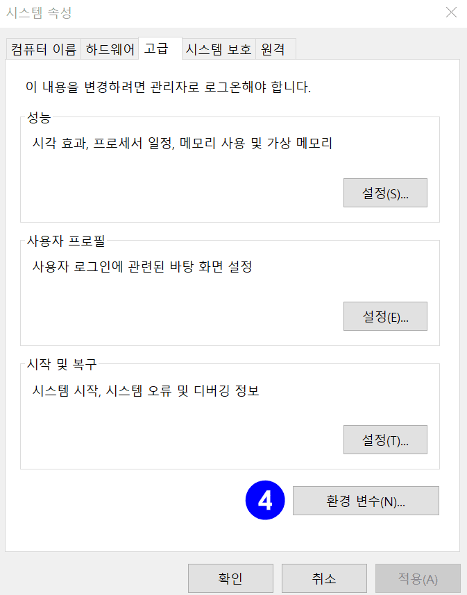 그러면 시스템 속성이 나오는데요. 여기서 맨 아래에 있는 환경 변수(N)을 누릅니다.