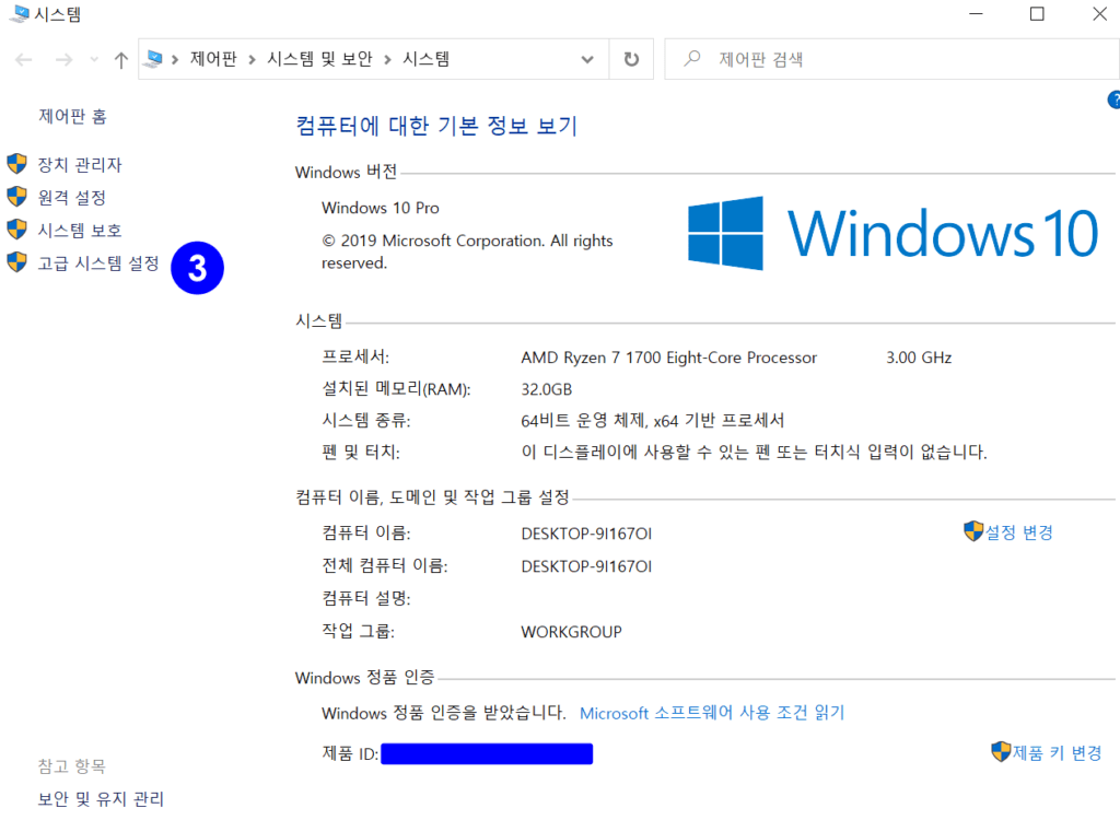 아래 이미지와 같은 시스템에서 왼쪽 중간에 있는 고급 시스템 설정을 누릅니다.