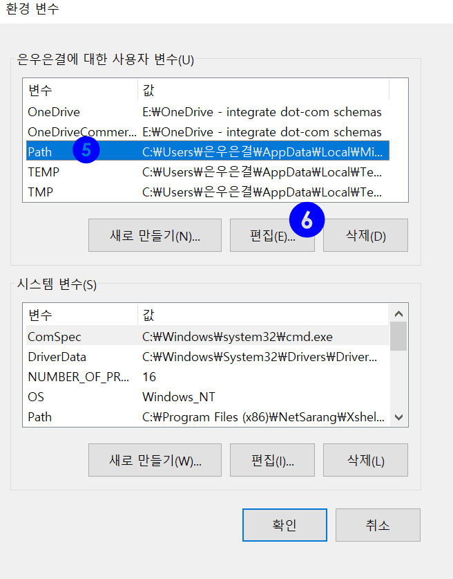 그러면 환경 변수 화면이 나타나는데요. 사용자 변수(U) 중에서 Path를 선택 후 편집을 클릭 합니다.