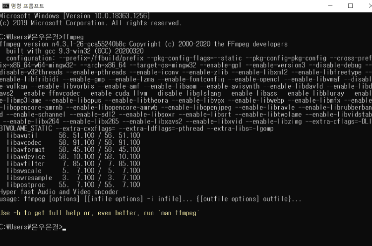 이 명령 프롬프트에서 ffmpeg를 치면 아래처럼 관련 사항을 주르륵 보여 주게 됩니다. 이러한 메세지가 나오지 않는다면 설치가 잘못 된 것입니다.