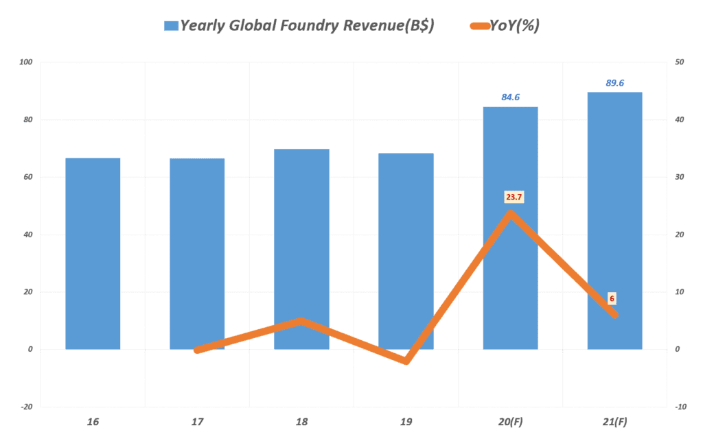 트렌포스는 2020년 글로벌 파운드리 시장에 대해서는 846억 달러 매출을 올려 전년 비 23.7% 성장해 근 10년 내 가장 높은 성장율을 기록할 것으로 봤습니다.