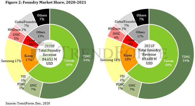 - TSMC 파운드리 점유율은 2020년 54%에서 2021년에도 54%를 유지할 것으로 전망