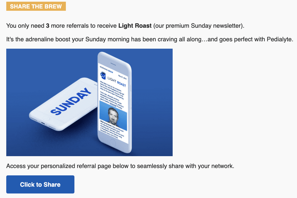 모닝브루가 발행하는 모든 뉴스레터에는 “Share the Brew”라는 전용 공유 섹션이 있습니다. 여기서 구독자들에게 모닝브루의 추천 시스템을 소개하고 있습니다. 이를 클릭하면 모닝브루 추천 허브로 이동합니다.