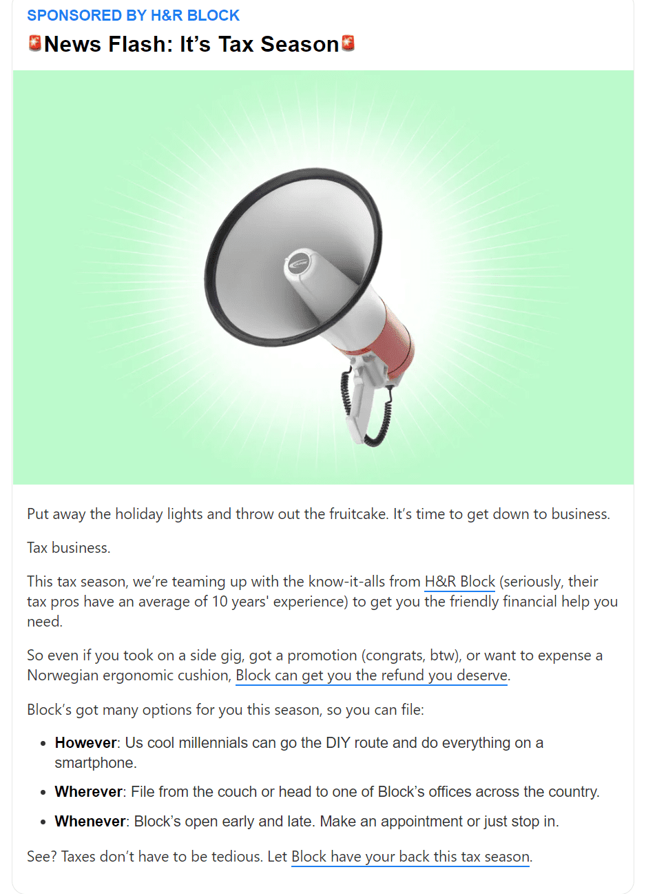 모닝브루 네이티브 광고는 다른 뉴스레터 콘텐츠와 동일한 포맷으로 작성됩니다. 그 내용은 모닝브루가 추구하는 뉴스레터 철학이 그대로 배어 있어 광고이기 때문에 뉴스레터 구독 경험을 해치지 않토록 충분한 정보를 전달하면서도 간결하면서 흥미를 불러일으키는 내용으로 구성됩니다.