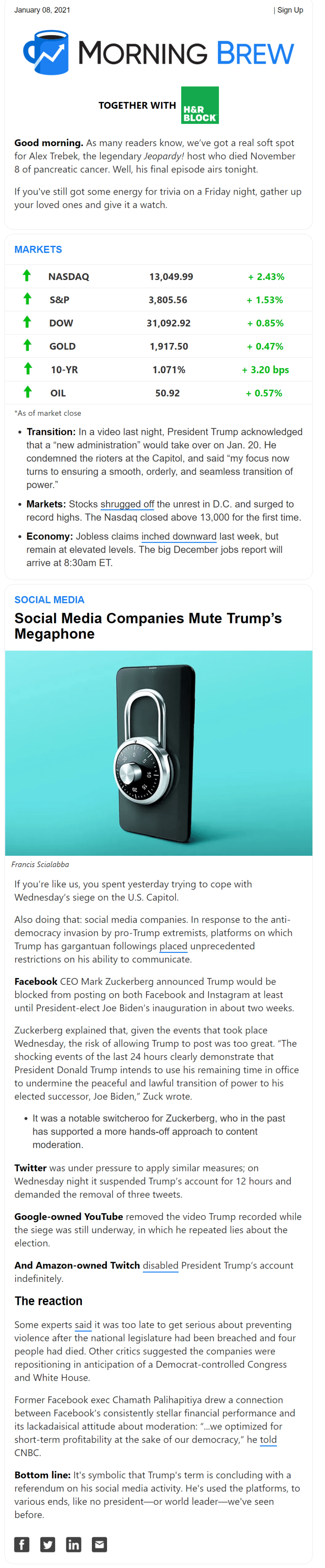 - 2015년 시작한 모닝브루는 2020년 봄 기준 200만 구독자를 가지고 있으며, 평균 뉴스레터 오픈율은 45% 수준