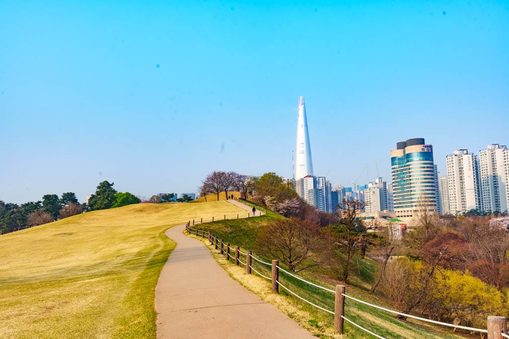 그래서 산책길과 롯데타워를 배경으로 담아본다.