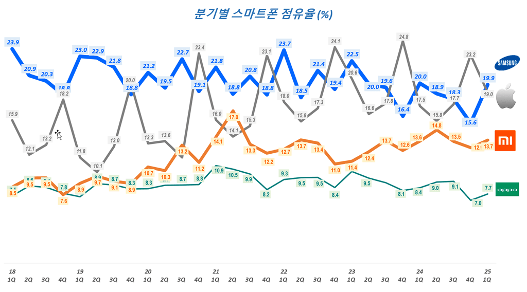 반면 IDC는 2025년 1분기 스마트폰 점유율은 삼성점유율이 애플 점유율을 앞섰다고 보고했다.