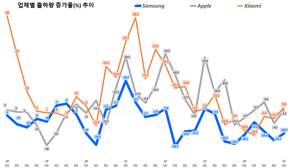 - 25년 1분기 스마트폰 출하량ㅇ느 3억 5백만대로 전년비 1.5% 증가
