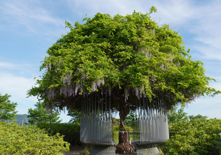 울창한 등나무 터널 숲의 등나무꽃 향기로 가득한 산언덕과 농사짓는 밭으로 둘러싸인 터널을 둘러보며 산책할 수 있다.