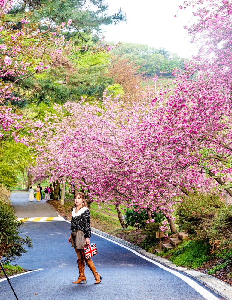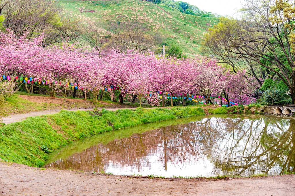 연못 건너서 연못과 입구길 겹벚꽃 풍경을 담으면 반영과 더불어 그럴싸한 풍광이 만들어진다.