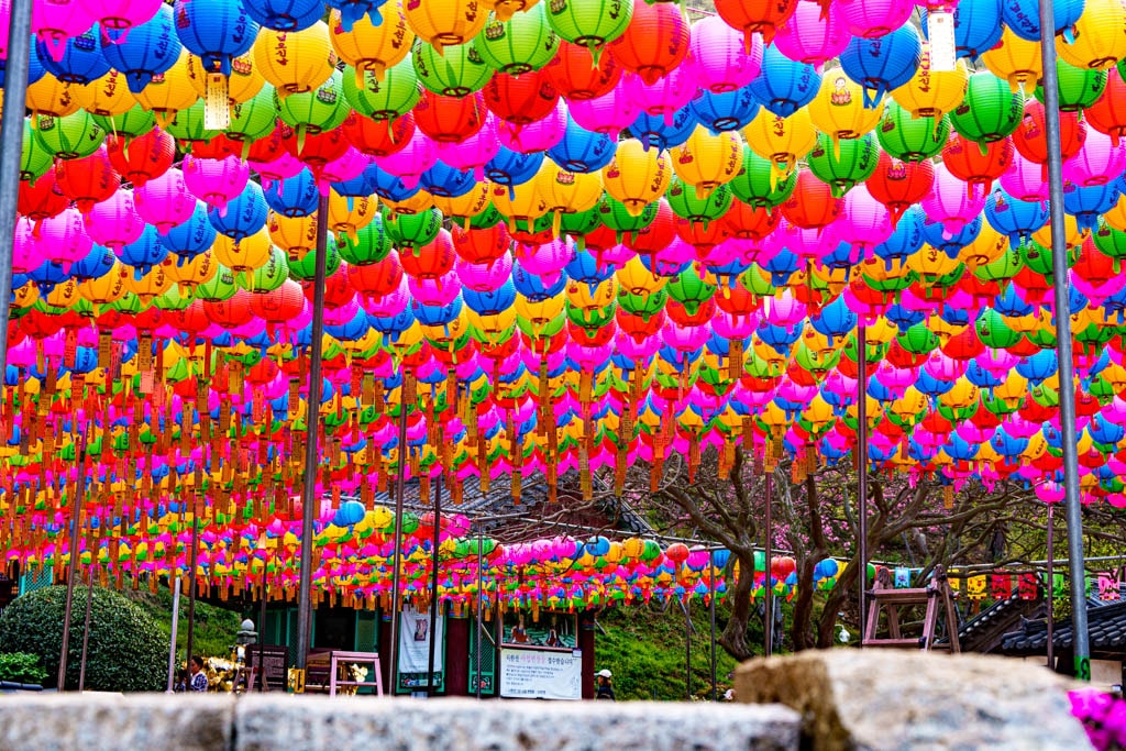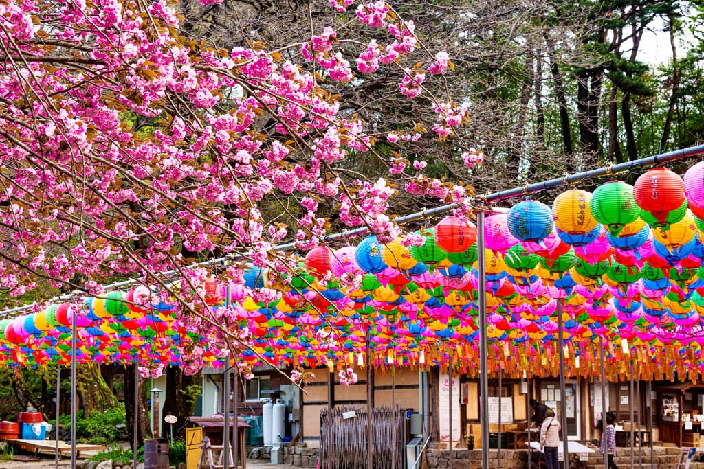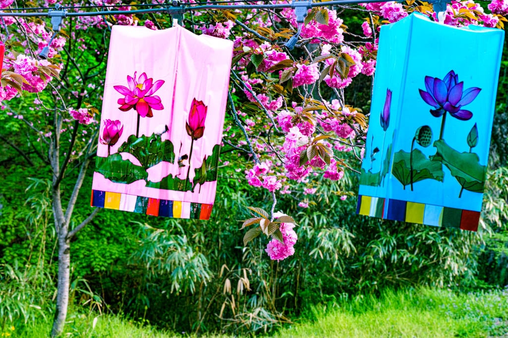 문수사 겹벚꽃은 문수사 입구문부터 시작하기도 하고 입구문 오른쪽으로 올라가면 문수사 방향으로 양쪽에 겹벚꽃 터널이 있다. 두군데 다 보는게 좋은데 그중에서 더 나은 곳은 입구문으로 오르는 길이다. 은 부처님오신날 연등이 걸려있는데 이 연등과 겹벚꽃과 잘 어울려 멋진 풍광을 만들어 준다.