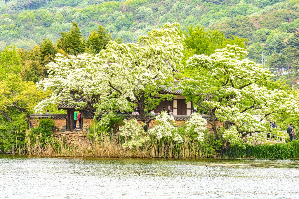 연못가를 따라 걷는 산책로에서는 꽃향기가 은은하게 퍼지고, 바람이 불 때마다 꽃잎이 연못 위로 흩날리며 환상적인 풍경을 연출합니다. 완재정으로 이어지는 돌다리를 건너 정자에 앉아 있으면, 물 위에 비치는 이팝나무꽃과 정자의 반영이 한 폭의 수채화처럼 펼쳐집니다. 이팝나무꽃은 4월 말부터 5월 초순까지 절정을 이루며, 이 시기에는 이른 아침부터 많은 사람들이 찾아와 봄의 절정을 만끽합니다.