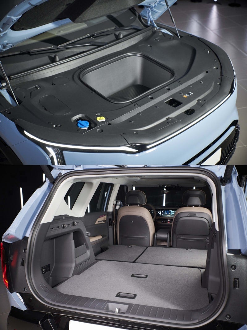 - 실내: 파노라마 글래스 루프(개방감 극대화), 2열 완전 폴딩 시 평평한 적재공간(차박, 캠핑에 최적), 513리터 트렁크, 전면 프렁크(프렁크) 제공.