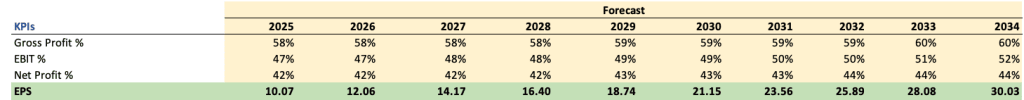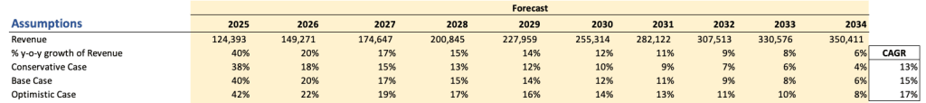현재 애널리스트들은 2025년 매출이 약 40% 성장할 것으로 보고 있다. 필자는 향후 10년간 연평균 15% 성장률(CAGR)을 가정했다. 이는 지난 10년간 실제 CAGR과 유사하며, 비교적 보수적인 추정이다. 신중함을 택했다.