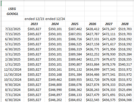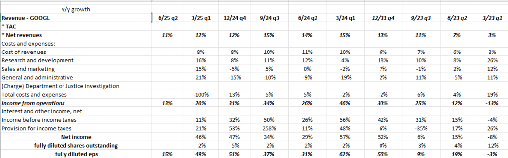 올해 2분기의 역설적인 측면은, 이번 분기가 2023년 9월 이후 최악의 분기가 될 것이라는 점이다. 당시 알파벳은 주당순이익이 전년 동기 대비 9% 성장했고, 매출은 11% 성장했으며, 영업이익은 25% 성장했다.