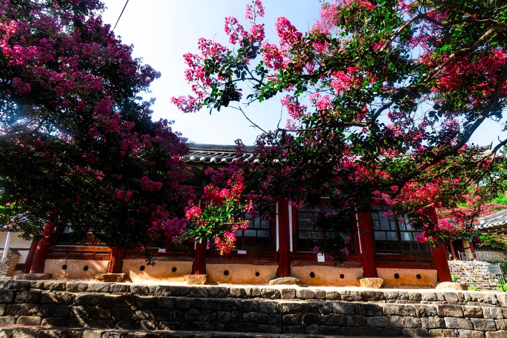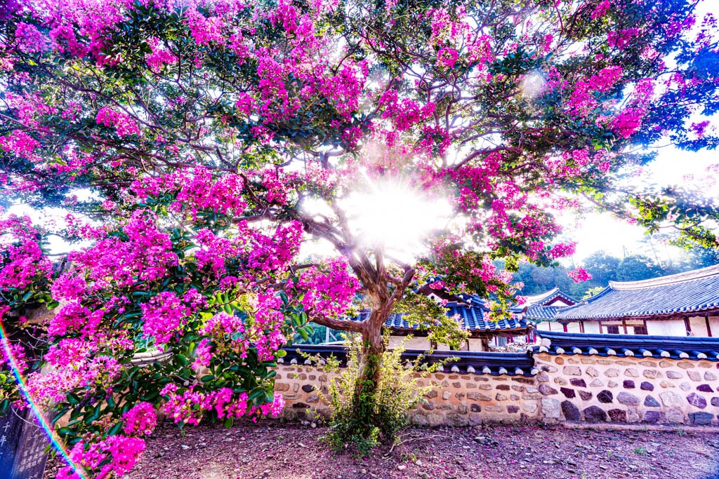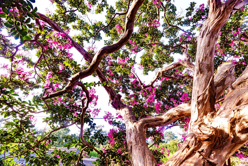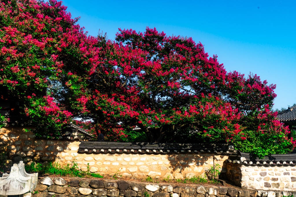 나무 아래쪽부터 위로 차례로 피는 꽃송이들은 백일 동안 피고 지기를 반복해 더 오랜 기간 화려함을 자랑하며, 고즈넉한 기와지붕과 전통건축, 그리고 선홍빛 꽃의 조화는 사진작가들과 여행객들에게 큰 사랑을 받는 대표적인 여름 풍경입니다.